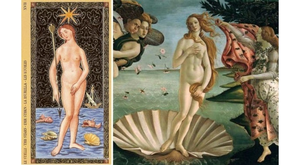 Рис. 28. Справа – Золотое Флорентийское Таро, слева – «Рождение Венеры» Сандро Боттичелли