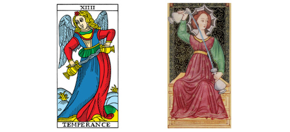 Рис. 31. Справа – Умеренность из Марсельского Таро (Jodorowsky & Camoin), слева – из Золотого Флорентийского Таро