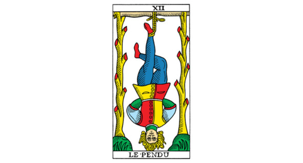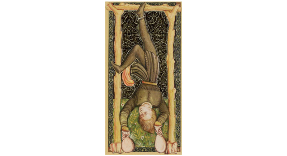 В Марсельском Таро изображен смешанный образ и Иисуса, и Иуды. Здесь человек либо жертвует собой, либо несет наказание, но в любом случае это добровольный поступок. Он не собирается действовать, чтобы спасти свое тело, потому что понимает необходимость спасти свою душу в первую очередь. Поэтому он не держится за материальное (Рис. 34).