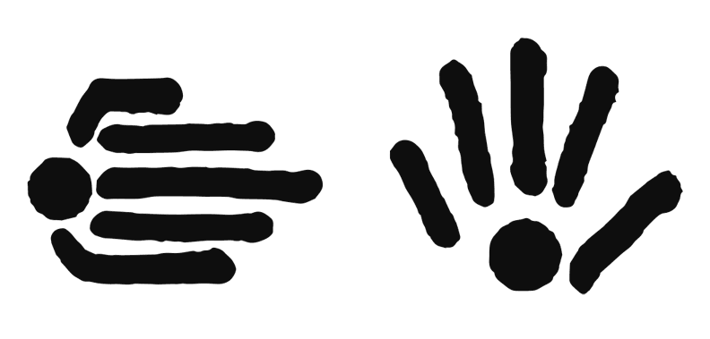 Читатель может понять физический жест как живой текст, повторив эту картинку: сомкнутые пальцы левой руки изображают страницу или экран, письменное знание в целом, а пальцы правой руки, разведенные, как на известном отпечатке в наскальном изображении, символизируют устную культуру и знания Первых народов. Предполагается, что рука с растопыренными пальцами подносится к глазам и становится линзой, через которую вы смотрите на руку с сомкнутыми пальцами.