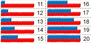 Детям предлагают сделать у себя на столах то же самое. Учитель обращает внимание детей на то, что в числе 10 цифра 1 обозначает количество десятков в числе, а 0 отсутствие единиц. После такого объяснения воспитатель ставит рядом с десятком палочек на доске еще одну палочку (дети то же делают у себя на столах), получилось один-на-дцать. Чтобы обозначить это число цифрой, вместо нуля ставится единица – это обозначает, что к одному десятку добавили единицу – и получается – 11». Дети убирают у цифры 10 ноль и ставят вместо него единицу или закрывают ноль единицей. Таким же образом учитель объясняет, как «записать» все остальные числа до 19. При этом единица, обозначающая десяток, не убирается, меняются лишь цифры, обозначающие количество единиц в числе. Показав, как записывается число девятнадцать, воспитатель предлагает к имеющимся десяти палочкам (положенным к связанному десятку палочек) положить еще одну. Итак, на столе перед детьми лежат два десятка палочек – один, положенный в начале, другой, полученный путем прибавления палочек. Детям предлагается вначале самим подумать, как можно «записать» число. Выслушав ответы детей, воспитатель объясняет, что стало два десятка палочек (два-дцать), поэтому цифру, обозначающую число десятков, надо заменить и поставить вместо цифры 1 цифру 2. Отсутствие единиц в этом числе обозначается цифрой 0. Таким образом, дети знакомятся с записью числа 20.