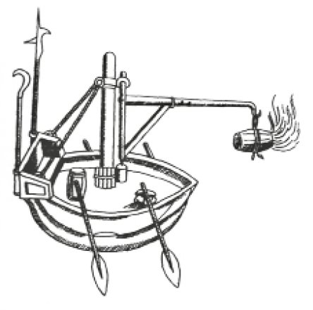 Боевой корабль с глиняной бочкой, из которой лили на неприятеля «жидкий огонь».