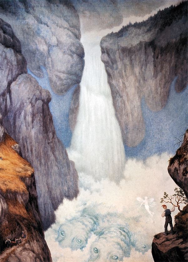 Светлой лунной ночью присядь у водопада – ты увидишь и услышишь, как внизу, в чёрной пропасти, среди пенистых водоворотов дух водопада, фоссегрим, исполняет величественную музыку – мелодии, созданные самой природой. Сначала ты различишь лишь могучий рокот, но потом музыка очарует тебя, и тебе самому захочется слиться с бурлящим потоком созвучий.