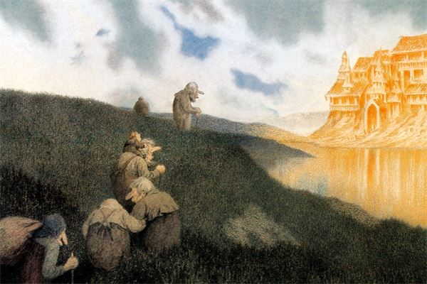 Долго ли, коротко ли, вышли они наконец на верный путь. В голубой дали, за тёмными горами, мерцало что-то, как звезда. Чудесное сияние переливалось всеми цветами радуги. И старые тролли кивнули друг другу: они-то знали, что найдут дорогу.