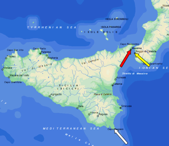 Мессина (красная стрелка), Реджио (желтая стрелка), мыс Пассаро (белая стрелка)