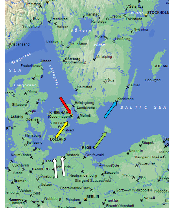 Копенгаген (красная стрелка), бухта Кьоге (желтая стрелка), Карлскруна (синяя стрелка), остров Борнхольм (зеленая стрелка), побережье Мекленбурга (белые стрелки)