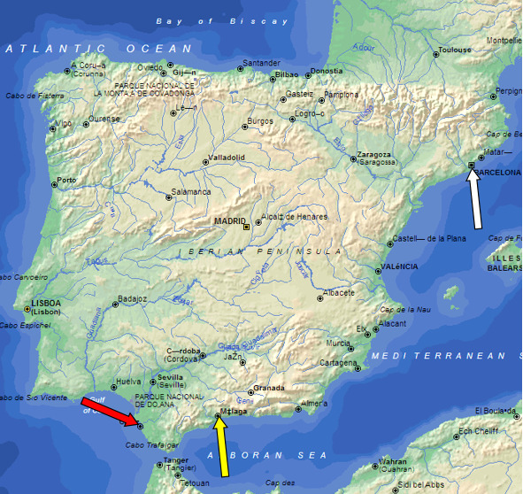 Кадис (красная стрелка), Барселона (белая стрелка), Малага (желтая стрелка)