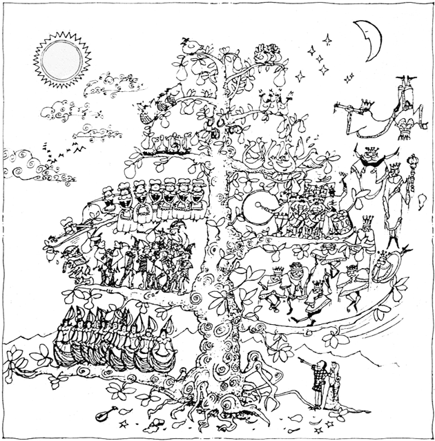 – Терпение! – ответила куропатка. – Вначале я хочу встретиться с некоторыми из твоих подданных. Будь добр, позови Королевского Птицелова, Хранителя Королевских Драгоценностей, Мастера Королевской Музыки, самого высокопоставленного лорда твоей страны, главную Королевскую фрейлину и, скажем, четырех крестьян. Они нужны мне, чтобы изготовить подарок. А потом я хочу, чтобы ты нанес визит принцессе и ее отцу и пригласил к моему грушевому дереву в горах.