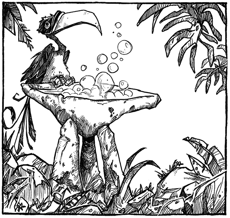 Прошло совсем немного времени, и к каменной чаше слетелось еще несколько птиц-дедушек. Они некоторое время ссорились, а потом, прерываясь время от времени на очередную короткую стычку, принялись серьезно пьянствовать, качаясь взад-вперед (потому что именно так двигаются птицы, когда пьют), потом – качаясь назад и вперед, и еще дальше вперед, и часто падая (потому что именно так передвигаются птицы, когда выпьют свежего пива). Одна птица поднялась в воздух и задом наперед улетела в кусты.