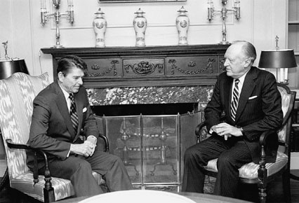 Серьезный Рейган, только что увидевший имитационный ядерный удар по США, с Уильямом Роджерсом, исполнявшим роль президента в продолжении военной игры «Лига плюща – 82». 1 марта 1982 года