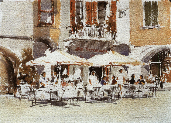 Pavement Café illustrates a small corner of a large pedestrian piazza. I selected this area because the patterns of the shapes generated a lively composition, and my aim was to try to catch the essence of the subject with the minimum of detail.