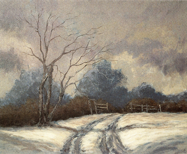 Preliminary studies will also allow you to try out different colour combinations in which perhaps you wish to convey mood or atmosphere. In Winter Landscape the mood was achieved by using complementary colours, yellow and purple, which when mixed gave a range of neutral colours tending to grey in the middle. This gave an unusual colour cast to a wintry subject with the inclusion of a warm sky that, combined with using a middle range of tonal values (without the extremes of black and white) gave a more muted feeling to the painting in general.