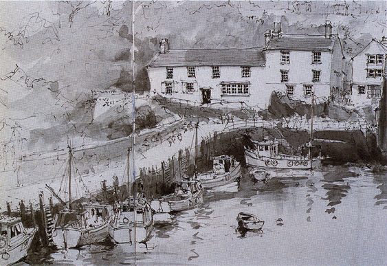 This is useful for dissecting complex subjects, such as in Polperro Harbour. The photograph shows almost the full extent of the elevated field of view I had of a harbour setting. Though there were several subject opportunities here, I was attracted to the particular part of the scene, shown highlighted, by the tonal contrast between the white cottages set against the darker foreground elements, and the dominant angle of the harbour wall, which had the effect of leading the eye into the scene. I made the drawing to record the essential elements of the view. The addition of a monochrome wash also gave a record of the main tonal distribution.