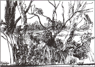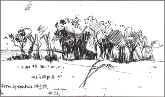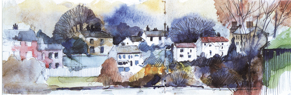 Houses in trees can make a very good subject. A sketch like this can provide a satisfactory reference for a finished painting. When the weather became wet I completed the view from my car.