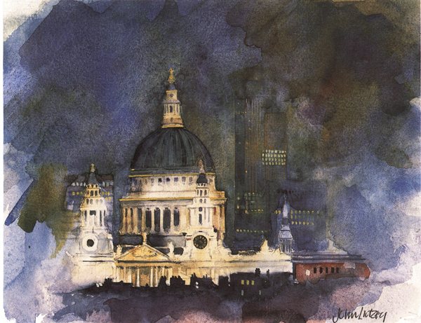 Cities at night offer interesting subjects. It is best to work from a photograph rather than try to create anything on the spot. In this case I introduced silhouettes of houses in the foreground to reinforce the floodlit effect. Loose brushwork was used for the sky to give it interest.