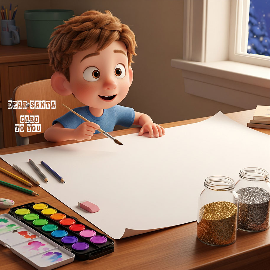 He cleared his desk, took a huge sheet of white paper that his father used for blueprints, got out his watercolor paints, pencils, eraser, and even two jars of glitter – and began to create.