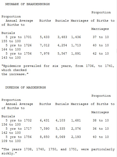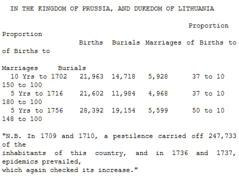 By great attention to cleanliness, the plague seems at length to be completely expelled from London. But it is not improbable that among the secondary causes that produce even sickly seasons and epidemics ought to be ranked a crowded population and unwholesome and insufficient food. I have been led to this remark, by looking over some of the tables of Mr Suessmilch, which Dr Price has extracted in one of his notes to the postscript on the controversy respecting the population of England and Wales. They are considered as very correct, and if such tables were general, they would throw great light on the different ways by which population is repressed and prevented from increasing beyond the means of subsistence in any country. I will extract a part of the tables, with Dr Price's remarks.