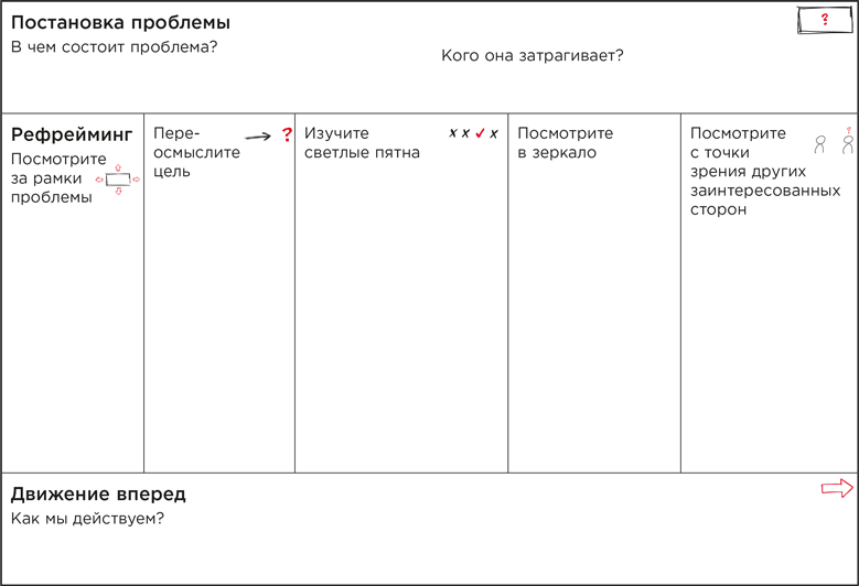 На следующей странице представлен вариант высокоуровневой канвы рефрейминга. Потратьте пару секунд, чтобы ознакомиться с ним, но не беспокойтесь из-за непонятных деталей – мы дойдем до них чуть позже. А пока просто обратите внимание на то, что метод состоит из трех основных шагов: Постановка проблемы, Рефрейминг, Движение вперед, где второй шаг включает ряд дополнительных стратегий.