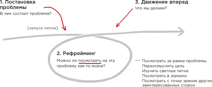 Как вы помните из канвы рефрейминга (приведенной в конце «Введения»), этот метод состоит из трех этапов – постановка проблемы, рефрейминг и движение вперед, – где второй этап включает в себя несколько стратегий. На следующем рисунке эта же структура представлена в виде прямой линии и петли.