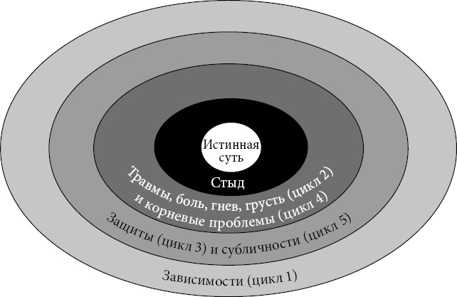 Модель луковицы, адаптированная под задачи психологии, представляет внутреннего ребенка, окруженного любовью и заботой, как ядро. Божественный ребенок – это истинная сущность, та, что несет в мир свет надежды и радости. Это самоощущение, которое должно находиться в самом центре нашего существа, однако мы крайне редко его проживаем. Когда мы руководствуемся чувством безопасности и доверия и знаем, что в нашем мире все хорошо, даже когда проходим испытания и встречаемся с препятствиями, полученный опыт создает связь с этой сущностью. Мы видим свет внутри, даже когда вокруг темно. Однако, ныряя в собственные глубины, вместо него мы встречаем плотный и болезненный слой стыда, который создает ложное убеждение, что мы изначально ущербны и, если кто-то откроет правду о том, кто мы есть, нас полностью и безоговорочно отвергнут. А это, в свою очередь, создает все новые и новые слои нездоровых адаптивных механизмов, которые сражаются за то, чтобы защитить нас от внутренней боли.