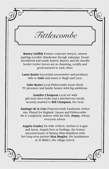 ‘We’ll have to start without him,’ Max Bingley complained to Richard Smart, an old prep-school friend of Henry’s and another new local face. Richard had recently accepted the position as Fittlescombe’s new GP, and with his wife Lucy was renting Riverside Hall in Brockhurst from Sir Eddie and Lady Wellesley, who were spending the year abroad.