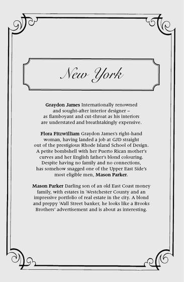 Flora Fitzwilliam, on the other hand, was engaged to be married to a wonderful, kind, handsome, intelligent, rich man. Mason Parker was the best thing that had ever happened to her, period. The second best thing was her job. At only twenty-three, straight out of design school in Rhode Island, Flora had landed her dream job, the dream job in interior design, working for the great Graydon James in Manhattan.