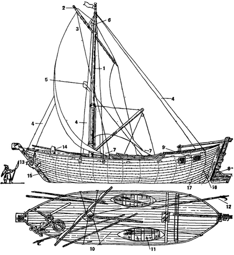 1 – шегла (мачта); 2 – райна (рея); 3 – подъемный волчок; 4 – ноги (ванты); 5 – буглина; 6 – дрог (фал); 7 – вожжи (шкоты); 8 – сопец (руль); 9 – казенка; 10 – палубы; 11 – карбасы; 12 – багор; 13 – якорь; 14 – кочка (ворот); 15 – обшивка со скобами; 16 – деревянные гвозди (нагели); 17 – скобы