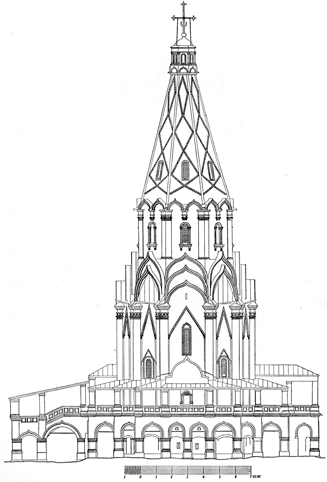 Но русская средневековая архитектура, будучи главным образом деревянной, развивалась несколько иным путем. Эллиптические купола, конечно, использовались и здесь, но это были в основном небольшие луковицы, а наиболее распространенным типом перекрытия стал шатер.