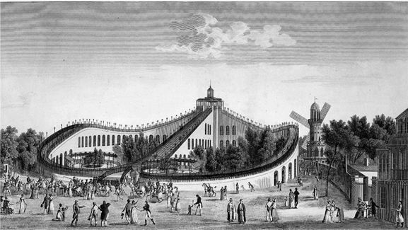 В 1812 году в Париже открылись первые в мире публичные русские горки. Французы не скрывали их происхождения: аттракцион назывался Les Montagnes Russes à Belleville, то есть «Русские горки в Бельвилле». В 1817-м у них появился конкурент – аналогичный аттракцион Promenades Aériennes («Воздушные прогулки») в парке Божон. Обе системы были не ледяными, а летними, с вагонетками, и в обеих было реализовано то, что отсутствовало в исходной русской конструкции, – цикличность. Катающаяся публика описывала круг и останавливалась в точке, откуда можно было быстро подняться к старту. Из Франции система перекочевала в Англию, а в 1840-х появились первые «железные дороги-центрифуги», то есть горки с замкнутой петлей. Той самой, которую полвека спустя запатентует американец Лайна Бичер.