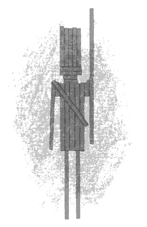 Под стеклянным колпаком – крошечный человечек, не выше пары спичечных коробков, поставленных друг на друга. Его маленькие одёжки совсем как кукольные, а под ним – подстилка из мха и сухих листьев. Кожа грубая, как у перчаток. Глаза закрыты.
