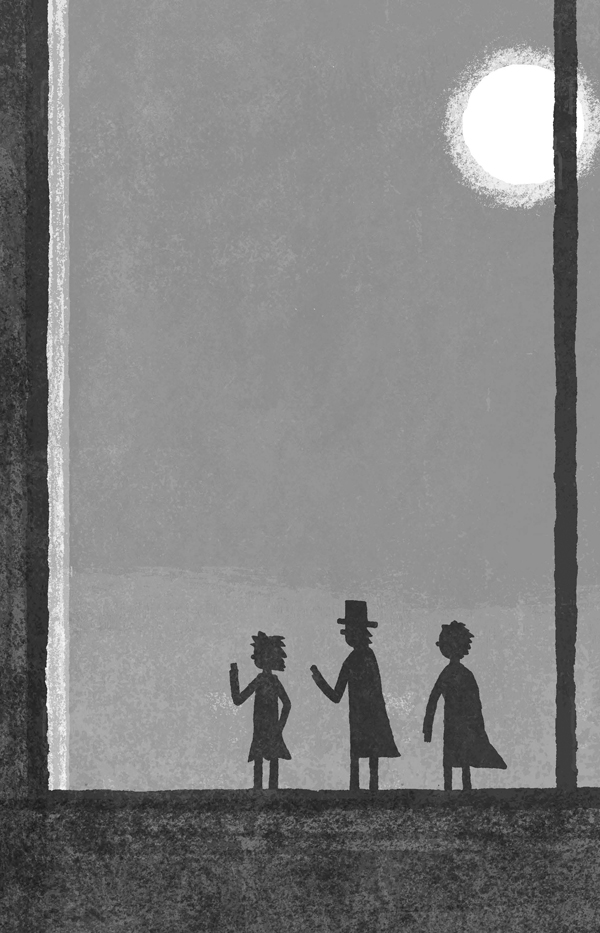 Оказывается, гость прибыл не один, рядом с ним стоит крошечная женщина, тоже в плаще, а ещё девочка. Открываю окно – мне страшно и радостно одновременно, – и маленькие человечки проскальзывают внутрь. Вот они стоят на подоконнике в нежном серебре луны: девочка примерно моего возраста, и у всех такие же тёмные волосы, как у малышки в колыбели.