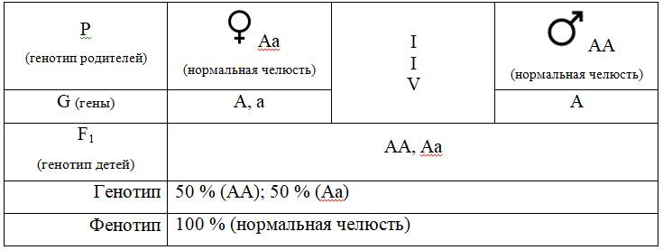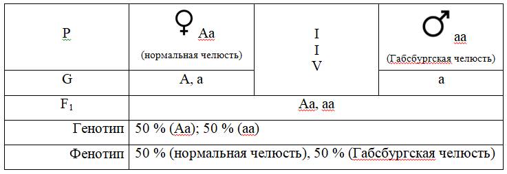Пример 1. Если родители имеют нормальную челюсть, но, допустим, мать одного из них имела Габсбургскую челюсть, то, их бракосочетание и вероятный генотип детей будут выглядеть следующим образом: