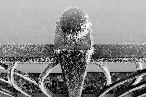 Солнце с каждым днём опускается всё ниже, и наступает момент, когда температура остаётся отрицательной круглые сутки. На реке появляется шуга – каша из кристаллов льда и воды, а вдоль берегов уже настоящий молодой лёд, на котором вырастают «цветы» инея (рис. 9). Иней уже и днём висит на кистях рябины и на ограде набережной реки (рис. 10, 11).