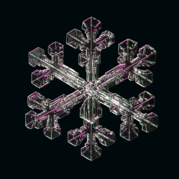 Материя не образуется из ничего, ещё древние придумали пословицу: Ex nihilo nihil fit – из ничего ничего не возникает. Снежинки образуются из насыщенного водяного пара в атмосфере. Понятно, что они не рождаются такими, какими падают на землю – ни по размерам, ни по форме. Изначально это бесформенные структуры. Пока это крошечные пылинки, они свободно парят в воздухе. Когда они дойдут до земли, пройдёт время и кристаллы подрастут. Одни упадут раньше, другие – позже, соответственно этому меняются и размеры. В процессе роста кристаллы приобретают правильную форму. Это обусловлено тем, что молекулам воды легче закрепляться на неровной поверхности, где сила связи с кристаллом сильнее. Таким образом кристалл сам себя строит. Этот процесс описан в книге1 Кеннета Либбрехта (Kenneth G. Libbrecht) – физика, профессора Калифорнийского технологического института, автора нескольких книг о снежинках.