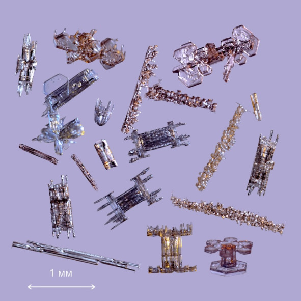 Естественная форма кристалла льда, обусловленная строением молекулы – это правильная шестигранная призма. Если её высота мала, то это пластина, если же она растёт в высоту, то превращается в стержень (колонну, иглу, палочку – назвать можно по-разному). Крошечные стержни (иглы) можно увидеть на рис. 16. Часто они бывают полыми на торцах.