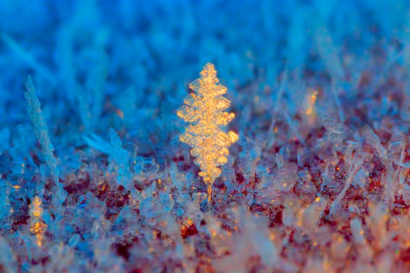 Рис. 7. Луч восходящего солнца осветил кристалл инея на крыше автомобиля