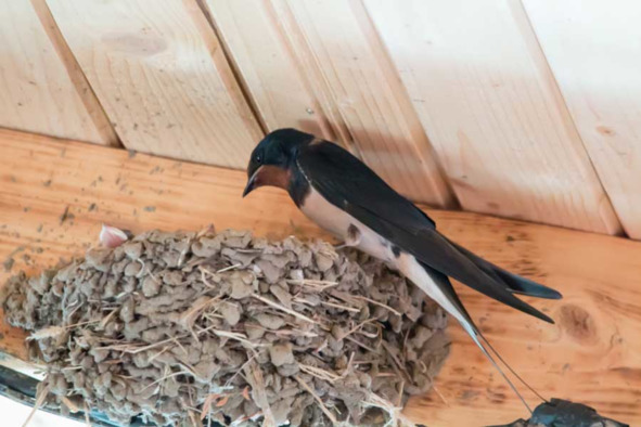 Рис. 25. Деревенская ласточка на гнезде под крышей летнего кафе. Снято в Болгарии