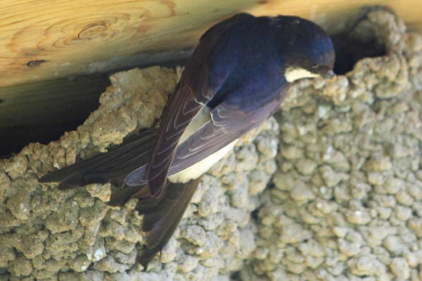Воронок (Delichon urbica) и деревенская ласточка (Hirundo rustica) строят хорошо всем известные гнёзда из комочков глины, склеивая их слюной. Самая доверчивая к людям ласточка – деревенская. Она настолько не боится людей, что часто выводит птенцов буквально на расстоянии вытянутой руки, где-нибудь на летней кухне, в дровянике или мастерской. Её не пугает даже стук молотка или шум пилы. На рис. 25 – гнездо деревенской ласточки под крышей летнего кафе, прямо над столиками. От воронка деревенскую ласточку легко отличить по двум длинным перьям-шильцам по бокам хвоста, которые вырастают у взрослых птиц после линьки. На лбу и на горле – красные пятна. У воронка таких перьев на хвосте нет, горло белое. Чаще всего они приклеивают свои гнёзда под карнизами деревянных домов, иногда целыми колониями (рис. 26). А вот к модному сайдингу гнёзда ласточек не прикрепляются…