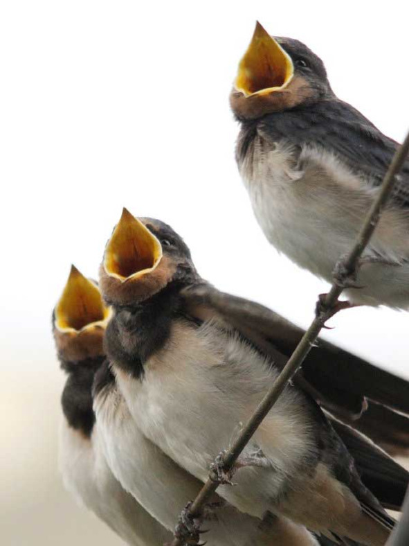 Рис. 30. Гооол! Слётки деревенской ласточки увидели родителя с кормом