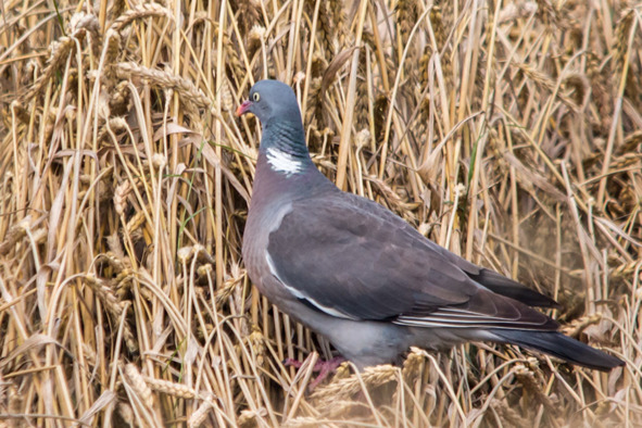 Совсем скрытный образ жизни ведут ещё одни представители семейства: лесные голуби клинтух и вяхирь (Сolumba palumbus). Клинтуха я вообще не встречал, а вяхири живут в лесу возле дачи в Волоколамском районе. Лес этот небольшой, перестоявший, с огромными старыми елями и множеством бурелома. Кого я там только ни встречал, а весной и в начале лета слышатся громкие гнусавые крики: «Ууу-гу, ууу-гу!» Но стоит направиться в сторону крика, как он тут же перемещается и звучит уже в другом месте. Это вяхирь. Иногда они пролетают над домами, тогда их можно рассмотреть. Вяхирь заметно крупнее обычного голубя, по бокам шеи у него белые пятна, хорошо заметные на снимках, сделанных даже с большого расстояния. Сложнее рассмотреть в полёте также белые пятна по верху крыльев, вблизи туловища. Фото на рис. 36 сделано в Московской области на поле переспелой пшеницы, куда вяхири прилетают кормиться огромными стаями