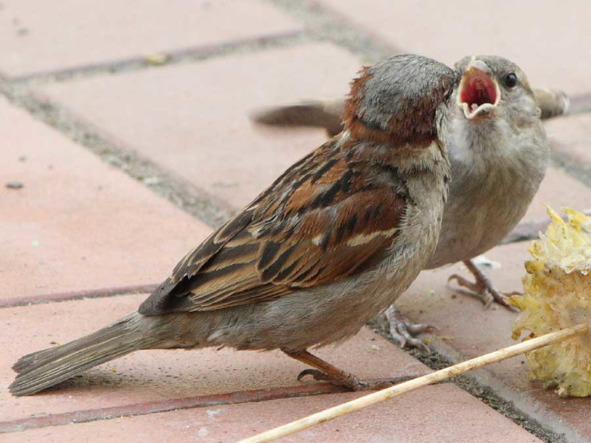 Рис. 7. Домовый воробей-папа кормит то ли дочку, то ли сыночка