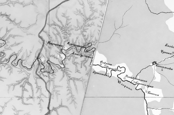 Начнём с карт. Как написал15 один умный человек, «в Лувре на старинной карте мира Казань есть, а на месте здешней столицы, увы – густой урман»16. Самой старой точно датированной картой, на которой обнаружилась релевантная информация, оказалась карта востока Европейской части России, составленная под руководством известного военного топографа, офицера Генерального штаба Ивана Афанасьевича (в украинском написании – Опанасовича) Стрельбицкого. Она составлялась в течение нескольких лет, но нужный нам участок датируется 1872 годом. На рис. 9 – выкопировка с этой карты. На ней мы видим деревни, о которых больше никаких других сведений нет: Воробьёва, Куташева, Фокина и Емнашева (на месте будущего пос. Мазур, он же Октябрьский). Возможно, эти деревни потом получили другие названия. Так, в учётных данных переписи населения 1920 года17 фигурирует деревня Антуфьевка, а на сайте Михайловской администрации18 в скобках указано прежнее название – Фоминовка. Учитывая, что названия деревень на карте Стрельбицкого указывались явно «на слух», вполне возможно, что Антуфьевка (Фоминовка) и д. Фокина на карте – это один и тот же населённый пункт. Но главное, это присутствие на Юрюзани (почти на всех картах и в документах до конца XX века река называется Юрезань) деревень Сарапуловка (на карте – Сарапалува), Усть-Кошелёвка (Ежовка, на карте – Устькошелева), Елабуга (Алабугина) и Бурцевка (на карте Бурцова). Причём Бурцевка изображена состоящей из двух частей, соединённых линией, и одна из этих частей расположена на месте Сафоновки. Таким образом, вышеперечисленные деревни образовались не позже 1872 года.