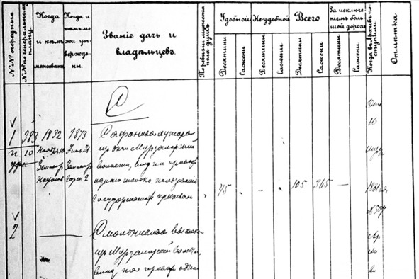 Следующий документ, который специалисты считают важнейшим при определении дат основания населённых пунктов – это планы дач Генерального и специального межевания. Реестр (в оригинале – «алфавит») участков (дач) по Златоустовскому уезду Уфимской губернии хранится в РГАДА (Российский государственный архив древних актов) и доступен в сканированном виде даже в интернете20.