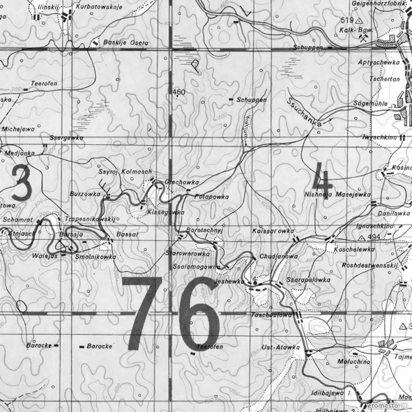 О двух картах, показанных на рис. 15 и 16, хотелось бы сказать особо. Рис. 15 – это выкопировка с немецкой карты 1941 года46. Уж не знаю, насколько серьёзно немцы собирались дойти до Урала, однако нельзя не отметить высокое качество изготовления этой карты. Она единственная, на которой показаны почти все населённые пункты; правда, зачастую с искажённым написанием, однако знающему язык догадаться нетрудно. На карту нанесены также лесные тропы и предприятия – как правило, крошечные. В правом верхнем углу показаны канифольный завод – Geigenharzfabrik и предприятие по производству извести – Kalk-Bgw. Вблизи Дувана на опушке леса находилась лесопилка – Sägemühle. Показаны также печи для выгонки дёгтя из берёзовой коры – Teerofen. Но самое интересное находится в левом нижнем углу участка карты: Baracke (бараки). Это не что иное, как спецпосёлки или лагеря, о которых речь пойдёт ниже. Их сознательно строили вдали от реки, где жило местное население, среди дикого леса. Один из этих посёлков наверняка является лагерем Кульвараш (встречается и другое написание – Кульваряш), о котором мало кто из местных жителей слышал, а вот немцы, оказывается, знали. Я так точно узнал о нём лишь несколько лет назад, когда начал интересоваться историей своей малой родины.