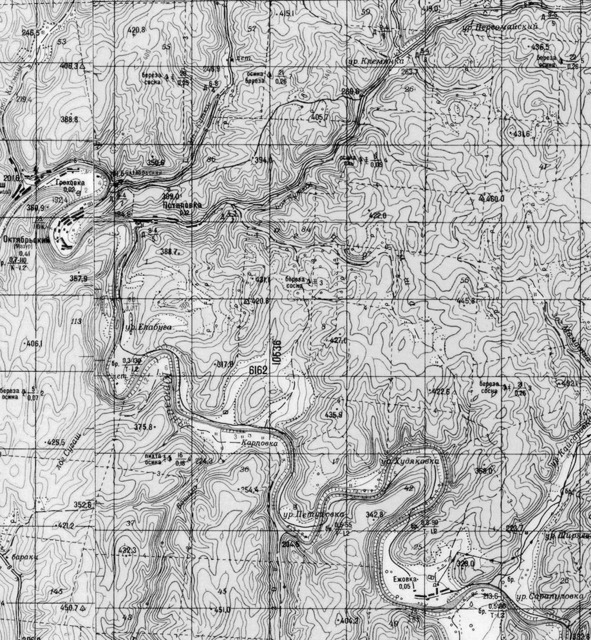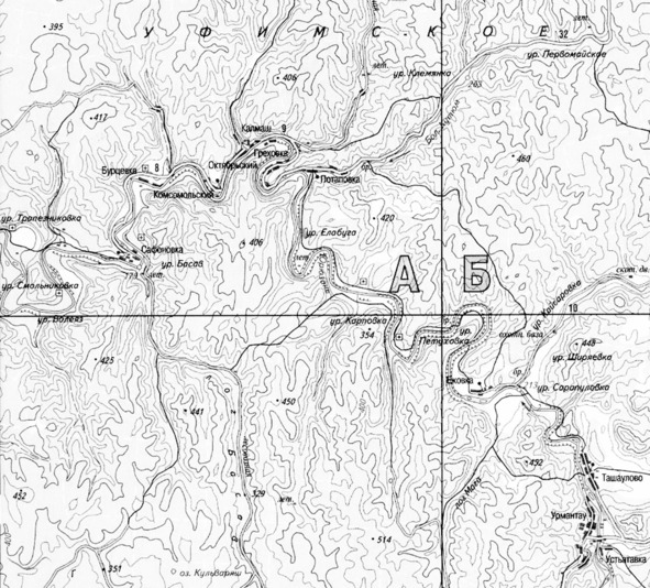 На рис. 17 и 18 – карта-километровка Генштаба по состоянию на 1984 год. Это самые подробные карты, имеющиеся в открытом доступе48 и рассекреченные лишь в 1990 году. Деревни на Юрюзани показаны уже как урочища, за исключением Ежовки и Греховки, доживающих последние годы, Потаповки, Октябрьского, Калмаша, Комсомольского, Бурцевки и Сафоновки.