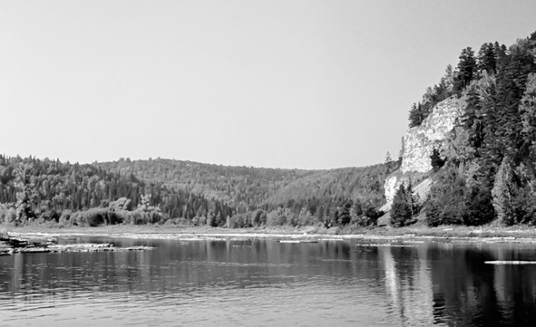 Рис. 23. Сплав леса по Юрюзани. Справа – скала Мечеть, 1972 год
