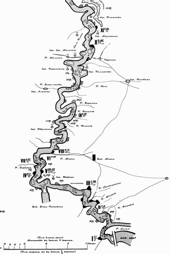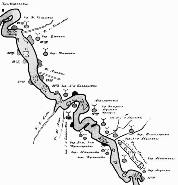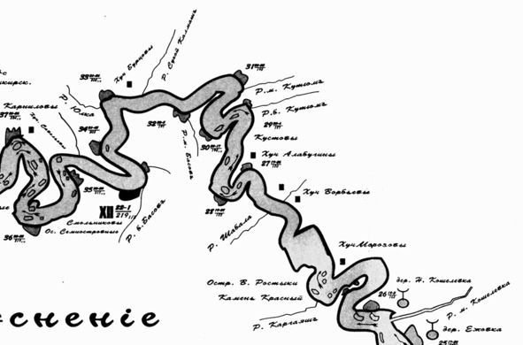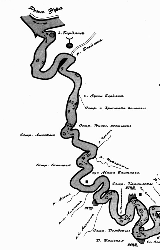 Рис. 36. Лоция Юрюзани на участке от Кошелёвки до Трапезниковки (хутор Савельевы на карте)