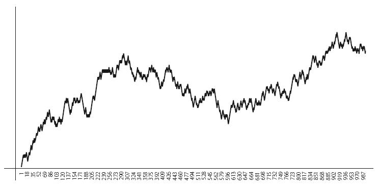 Представим себе условного трейдера по имени Надежда. И допустим также существование финансового инструмента – акций акционерного общества «Хаос», которыми Надежда всю жизнь торгует. Мы заранее условимся, что цена этих акций изменяется по совершенно случайным законам. Надежда изучила технический анализ и свято верит в то, что он работает. Глядя на график цены ОАО «Хаос» (рисунок 5), Надежда вроде бы видит тенденции, видит поддержки и сопротивления. И думает, будто это все поможет ей заработать. В действительности же, что бы Надежда ни делала, какой бы теханализ она ни изучала – долгосрочно зарабатывать таким образом она не сможет. Это факт! Это простая математика. (Представьте, что вы применяете теханализ к графику бросков монетки – сколько ни анализируй, шанс выпадения орла все равно будет 50/50.) Добавьте биржевые сборы и брокерские комиссионные к каждому броску монеты – и ваш капитал медленно, но верно пойдет вниз с каждым новым броском.
