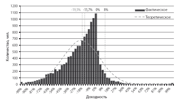Поясню график. График демонстрирует, сколько трейдеров (вертикальная ось) показали доход в определенном интервале. Например, годовой доход от 0 до +5 % – 1100 человек, а от +5 до +10 % уже 500 и т. д.
