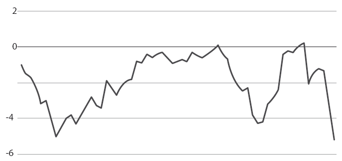 Приведу яркую иллюстрацию к сказанному из собственной жизни. Допустим, каждое событие оказывает влияние на мое настроение в той или иной степени со знаком плюс или минус. Если суммировать все эти события, то получится условная кривая настроения. Понятно, что каждый убыток на бирже, каждая ошибка будут опускать вашу кривую настроения. Вот как выглядит мой график настроения в не особо удачный период торговли (с учетом не только ее, но и всех событий):